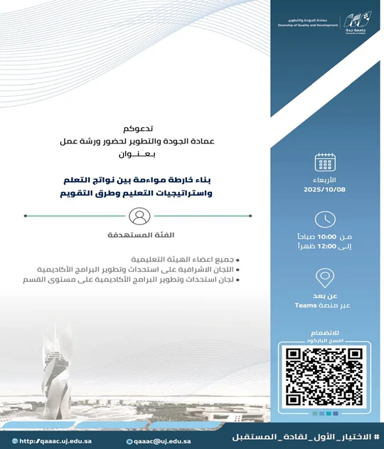 The Deanship of Quality and Development is the newest deanship at the University of Jeddah. It was established on October 3, 2023, by merging three central and vital entities within the university: the Quality Assurance and Academic Accreditation Administration, the Curriculum and Academic Programs Administration, and the Institutional Transformation Office. The deanship is responsible for all tasks and activities related to both administrative and academic quality assurance, the creation and development of academic programs, and strategic planning processes.