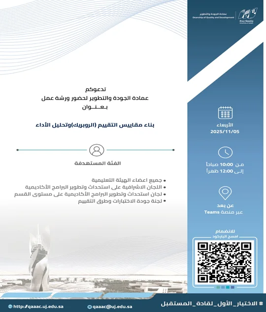 The Deanship of Quality and Development is the newest deanship at the University of Jeddah. It was established on October 3, 2023, by merging three central and vital entities within the university: the Quality Assurance and Academic Accreditation Administration, the Curriculum and Academic Programs Administration, and the Institutional Transformation Office. The deanship is responsible for all tasks and activities related to both administrative and academic quality assurance, the creation and development of academic programs, and strategic planning processes.